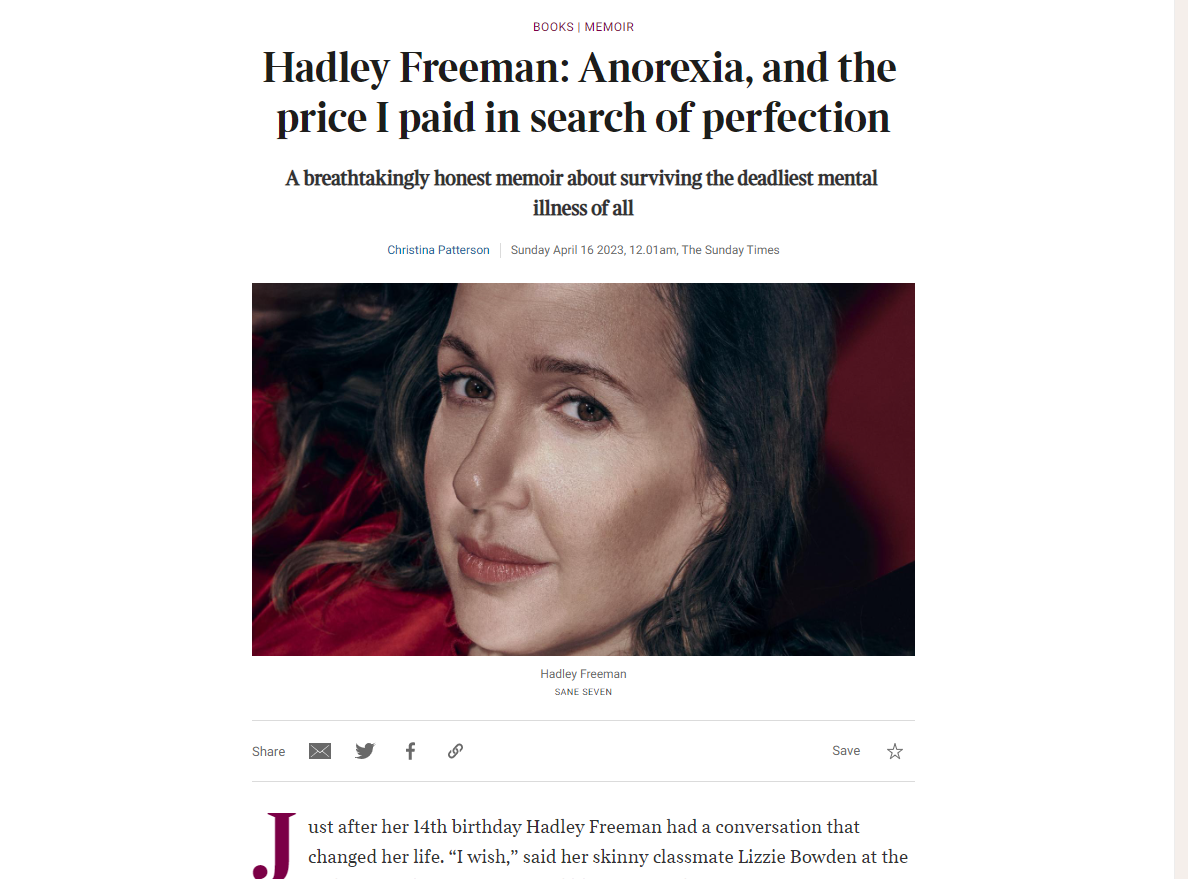 Hadley Freeman has been tireless in telling of her experience and giving advice for those suffering or those who know someone suffering with anorexia. Campaign highlights include TV appearances on ITV’s Lorraine, Newsnight on BBC 2 and Sky News with radio interviews including Woman’s Hour, Nihal Arthanayake on BBC Radio 5 and Times Radio. The Sunday Times carried the serial with reviews following across the board including in the Telegraph, Observer, Guardian, Times, Sunday Times, Financial Times, TLS, New Statesman, Daily Mail, Mail on Sunday and the Evening Standard.